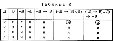 Чтобы проверить правильность заключения, построим для него таблицу истинности (табл. 8).