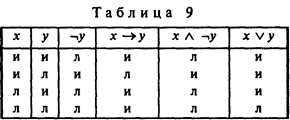 Обратимся теперь к другому случаю и определим, например, следует ли формула х Ú у из формулы (х → у) Ù (x Ù y). Для этого снова построим таблицу их истинности (табл. 9).