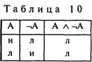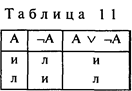 Отсюда становится ясным, что тавтологии (тождественно истинные высказывания) можно использовать для представления всех законов логики или любых общезначимых ее формул. Действительно, закон непротиворечия, запрещающий противоречия в рассуждении, можно выразить формулой (A Ù A), которая представляет собой тавтологию, в чем можно убедиться, построив для нее соответствующую таблицу истинности (табл. 10). То же самое можно сказать о законе исключенного третьего – (A Ú A) (табл.11).