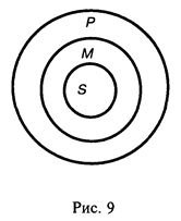 На рис.9 видно, что класс, который характеризуется предикатом Р, включает в свой объем классы М и S, а класс М содержит класс S.