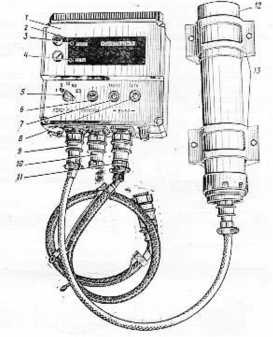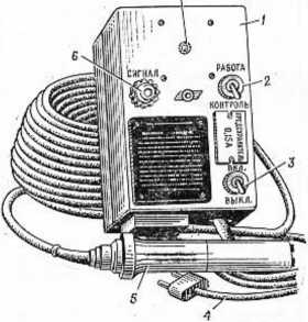 Рис. 1. Инднкатор-сигнализатор ДП-64: 1 — пульт сигнализации; 2 — тумблер РАБОТА — КОНТРОЛЬ; 3- тумблер ВКЛ. - ВЫКЛ.; 4 - кабель питания: 5 —блок детектирования: 6— сигнальная лампа; 7 —динамик типа ДЭМ. В комплект входят: прибор, укладочный ящик, техническое описание и инструкция по эксплуатации, формуляр, ЗИП