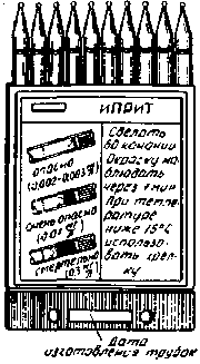 При работе с индикаторной трубкой можно определить примерную концентрацию ОВ в воздухе путем сравнения окраски, появившейся на наполнителе индикаторной трубки, с окраской, изображенной на этикетке. Внизу кассеты указаны дата изготовления и гарантийный срок индикаторный трубок, вложенных в кассету. Кассета закрыта бумажным чехлом.