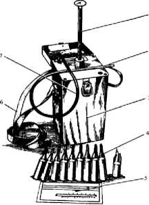 | 1. шток 2. индикаторная трубка 3. воздухозаборное устройство 4. ампулы с индикаторным порошком 5. шкала 6. ремень 7. резиновая трубка |