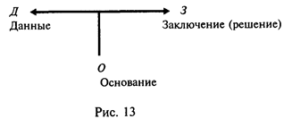 Графически связь между этими компонентами аргументации можно изобразить стрелкой (рис. 13), направленный от данных (Д) к заключению (З), которая показывает, что последнее подтверждается этими данными. Основание, разрешающее переход от данных к заключению, изображается прямой, перпендикулярной к горизонтальной стрелке.