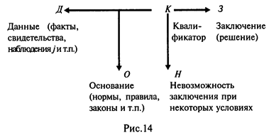 Обратимся к конкретному примеру, Как известно, по российскому законодательству ребенок, родившийся на территории России и некоторых других государств СНГ, считается гражданином этого государства, если его родители не являются иностранцами. С другой стороны, в некоторых прибалтийских государствах такой ребенок не может считаться их гражданином, даже если его родители проживали на территории этих государств десятки лет и раньше считались их гражданами. Таким образом, один и тот же факт может аргументироваться по-разному в зависимости от того основания, с помощью которого происходит переход от факта или данных к заключению. В одном случае основание (закон) разрешает считать ребенка гражданином страны, в другом – запрещает. То же самое можно сказать о других нормах и законах юридического характера, которые входят в соответствующие уголовные и гражданские кодексы различных государств. Конечно, при этом существует определенные ограничения и разъяснения к этим законам, которые можно выразить с помощью квалификатора аргументации. Поскольку квалификатор выражает степень возможности или вероятности заключения при данном основании, то на схеме его обычно ставят перед заключением. Эта вероятность при некоторых условиях превращается в невозможность, и тем самым заключение (или решение) в такой ситуации сделать нельзя. Эти условия и ограничения представляются стрелкой Н, идущей вертикально вниз от квалификатора К. Общая схема аргументации с такими дополнениями представлена на рис. 14.