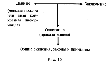Нетрудно показать, что все дедуктивные рассуждения укладываются в общую графическую структуру аргументации (рис. 15), в котором основанием для заключения выступает правило вывода силлогизма или иное правило дедуктивного умозаключения. Эти правила, в свою очередь, опираются на некоторые общие суждения, в которых аккумулированы многочисленные подтверждающие их факты, и именно поэтому они играют решающую роль во всех дедуктивных рассуждениях. В качестве данных в сфере аргументации используется либо меньшая посылка либо иная информация, характеризующая условия применения правила к данному конкретному случаю.