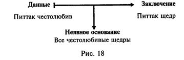 Структура аргументации в форме энтимемы выглядит весьма просто: она начинается с имеющихся данных, подтверждающих выдвигаемое мнение, предположение или гипотезу, и кончается заключением, хотя и в данном случае неявно присутствует основание, разрешающее или оправдывающее переход от данных к заключению. В силлогизме, как и в энтимеме, основанием для перехода от общего к частному служит именно общая посылка, ибо она, как мы видели, опирается на аксиому, согласно которой общее знание распространяется на все частные случаи. Так, в примере, приводимом Аристотелем, "Питтак щедр, ибо честолюбив" основанием для такого заключения является пропущенная в речи общая посылка "все честолюбивые щедры". Схема такой аргументации представлена на рис. 18.