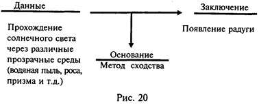 Мы можем сказать поэтому, что все индуктивные умозаключения служат в качестве основы аргументации, позволяя делать переход от фактов к выводам, но эти основания различаются по тем методам, которые при этом используются для обоснования перехода. Вспомним, что говорилось о методах сходства, различия и сопутствующих изменений в гл.5. Если у нас возникает догадка, что причиной возникновения данного следствия (или действия) служит некоторое другое явление, то мы должны рассмотреть все случаи, где это явление (или признак) встречается, и, следовательно, то, что является общим для всех случаев, будет причиной появления другого явления. Так, анализируя причину возникновения радуги после дождя, образования водяной пыли у водопадов, а тем более прохождения света через прозрачную стеклянную призму, мы можем убедиться, что во всех этих случаях наблюдается общее явление – прохождение солнечного света через прозрачную среду, следствием чего и служит образование радуги или разложение белого света на составляющие его цвета. Основанием для такого логического заключения служит индуктивный метод сходства, который, однако, не раскрывает конкретного механизма физической дисперсии света. Речь поэтому идет лишь о логическом обосновании такой формы аргументации, которую можно изобразить графически (рис.20).