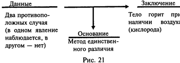 Данный метод аргументации сводится к пассивному наблюдению и выявлению сходства в различных случаях. Значительно большими преимуществами обладает метод единственного различия, который дает возможность активно вмешиваться в процессы и экспериментировать с ними. Так, мы можем легко установить, что причиной прекращения горения тела является отсутствие доступа воздуха, а точнее, кислорода, который поддерживает процесс горения. Здесь достаточно рассмотреть всего два случая: в одном воздух (кислород) поступает к горящему телу, в другом – нет. Схема такой аргументации упрощается относительно анализа данных, что видно из рис. 21.