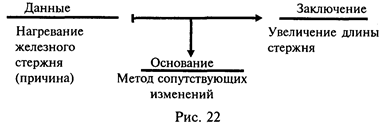Третий метод индуктивных умозаключений относится, как известно, к тем случаям, когда одно изучаемое явление или свойство нельзя отделить от другого, поскольку одно из них изменяется в соответствии с изменениями другого. Поэтому такие изменения называют сопутствующими. Обычно связь между двумя явлениями можно выразить количественно с помощью подходящих математических функций. Так, если увеличивается давление на газ, то соответственно уменьшается его объем; с нагреванием тела увеличиваются его размеры, с увеличением затрат на производство продукции возрастает ее цена и т.д. Во всех этих случаях сопутствующие явления или свойства изменяются прямо или обратно пропорционально друг другу и важнейшие из них теперь известны как эмпирические законы (закон Бойля–Мариотта, теплового расширения, экономический закон и т.д.). По мнению Дж. С. Милля, именно метод сопутствующих изменений служит основанием, с помощью которого оправдывается переход от наблюдаемых данных к заключению о существовании причинной связи между ними. Схематически это можно представить в виде рис.22.