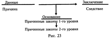 Можно ли согласиться с Миллем, что с помощью этого и рассмотренных выше методов сходства и различия доказывается причинная связь? Более тщательный анализ показывает, что эти методы раскрывают регулярные, повторяющиеся связи между явлениями, которые можно наблюдать непосредственно. Почему мы должны считать причиной уменьшения объема газа увеличение его давления, а не наоборот, уменьшение объема причиной увеличения его давления? Можно ли с достоверностью утверждать, что именно поступление воздуха поддерживает горение, а не какая-либо другая причина? Во всех этих и других случаях прежде чем установить причину, необходимо сделать предположение, что именно данное явление вероятно может быть причиной. Кроме того, найденная с помощью наблюдения или эксперимента причина может зависеть от другой, более глубокой причины, которая может быть обнаружена с помощью теоретического исследования. Так фактически и обстояло дело в истории научного познания. Сначала были определены причинные связи первого уровня, такие, как закон Бойля–Мариотта, теплового расширения тел и аналогичные им законы. На втором, теоретическом уровне познания был раскрыт внутренний механизм протекающих при этом процессов с помощью понятий и методов молекулярно-кинетичекой теории вещества. Только после этого стало возможным установить подлинные каузальные (или причинные) законы и с их помощью понять и объяснить простейшие эмпирические законы причинного характера. Поэтому в научном познании каузальная аргументация всегда связывается с наличием подлинного причинного закона теоретического характера, так как при эмпирическом исследовании всегда существует опасность принять за причину то, что кажется только причиной или само зависит от другой причины. Разумеется, это вовсе не отрицает необходимости и важности изучения простейших причинных зависимостей на первом этапе исследования, когда открываются эмпирические законы, которые выступают в качестве своеобразного моста, соединяющего теорию с конкретной действительностью. В общей схеме каузальной аргументации (рис. 23) ее основанием служат причинные законы разного уровня общности и глубины, начиная от простейших, доступных наблюдению, и кончая теоретическими, раскрывающими сущность и механизм причинных связей.