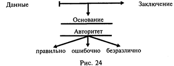 С помощью графической схемы можно представить не только методы правильной, обоснованной аргументации, но и такие приемы, которые считаются некорректными или даже ошибочными. В них данные могут быть вполне надежными, но заключения не опираются на допустимые основания аргументации. Типичен в этом отношении пример с аргументацией к авторитету. Здесь в принципе возможны три случая (рис.24): в первом случае ссылка на авторитет обоснована, во-втором – ошибочна, в третьем произвольна и не имеет отношения к рассматриваемой аргументации.