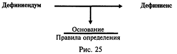 В ходе аргументации очень часто возникают споры об определениях понятий, значениях слов и терминов. Вопрос сводится к тому, какие правила служат для определения понятий и терминов, когда оказывается, что спорящие не столько нарушают логические правила определений, сколько придают разный смысл понятиям, терминам и выражениям. В истории науки известны случаи, когда ученые одним и тем же термином и понятием обозначали разные явления, вследствие чего между ними происходили нескончаемые и бесплодные споры. Так, сторонники Декарта под "механической энергией" понимали "количество движения", а Лейбница – "кинетическую энергию", и поэтому спорили совершенно зря. Структура аргументации при определении понятий носит иной характер, чем при умозаключениях, так как вместо данных здесь используется дефиниендум (определяемое понятие), а дефиниенсом (определяющее понятие) заменяется заключение (рис. 25).