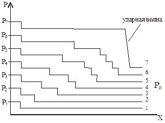 Рис. 21. Схема образования де-тонационной волны: Ро< Р1 < Р2 < Р3 < Р4 < Р5 < Р6 < Р7; 1-7 – нарастание давления в слоях с 1-го по 7-ой.
