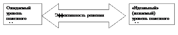 Следовательно, получается, что эффективность решения это субъективная оценка его качества, оценка, с точки зрения ЛПР, полезности рассматриваемого решения для достижения цели операции. Такую оценку ЛПР выносит для себя перед ответственным моментом — принятием решения о том, какую из альтернатив в операции предпочесть. Именно эта оценка и является рациональной основой для осмысленного выбора. Окончательно примем, что эффективность решения — это степень соответствия ожидаемого уровня полезного эффекта для ЛПР от проведения операции желаемому (идеальному) уровню полезности. Экспликацию понятия «эффективность решения» иллюстрирует рис.2.1.