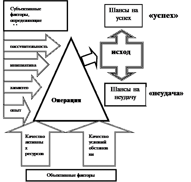 В качестве основных модельных исходов реализации какого-то решения концептуально выделим лишь два и назовем их «Успех» и «Неудача». Поскольку эффективность решений для ЛПР определяется не только соотношением величин полезности успеха или тяжести неудач, но и соотношением шансов на успех и неудачу, учтем и эти меры неопределенности. Удобную интерпретацию представляет простая графическая модель связей между основными факторами, влияющими на эффективность решений, изображенная на рис. 2.2. Эта модель описывает связи между двумя основными группами факторов, влияющих на исходы операции, а именно: объективными и субъективными.