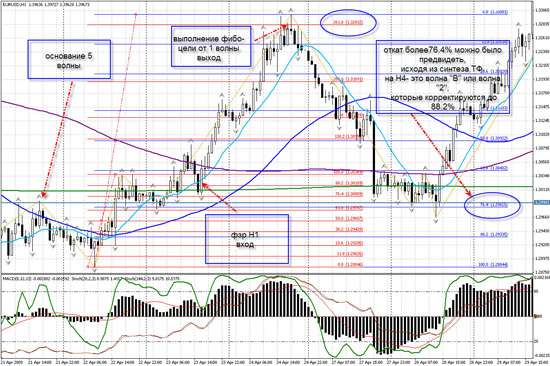Для прогноза направления движения цены необходимо понимание того, как происходит развитие движения по отношению к общему направлению старшего тренда. Три или четыре экрана графиков дают возможность для синтеза различных таймфреймов между собой. Понимание такой связи даст возможность увидеть коррекцию и направление тренда, например: 5-ти волновой бычий импульс М5 оказался коррекцией Н1,после которого последует медвежий тренд вниз, вместо ожидаемого движения вверх. Синтез ТФ дает ясное представление о том, в какой структуре волны мы находимся на данный момент и дает возможность прогнозировать дальнейшее развитие рынка. На рисунке приведен пример синтеза таймфреймов Н1 и Н4. В данном случае, пяти-волновая структура бычьего движения вверх на Н1, является первой волной на Н4, после которой последовал вполне предсказуемый глубокий откат. Причем, глубина отката вполне согласуется с Фибо уровнем в 76.4% и уровнем ФЗР.
