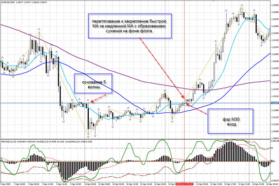 Особое внимание следует обратить на тот факт, что во флэте, в отличие от тренда, скользящие средние не работают по классическим правилам, а скорее наоборот. Таким образом, наша задача заключается в отсечении флэта и работа только в импульсном движении, Основные модели взаимного расположения скользящих средних для начала тренда имеют свойство повторяться с большой степенью достоверности. Именно повторяемость лежит в основе прогноза.