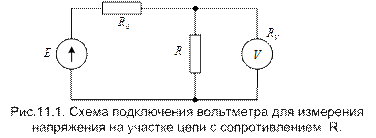 Для уменьшения погрешности измерения напряжения мощность потребления вольтметра должна быть мала, а его внутреннее сопротивление велико (R V