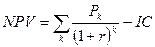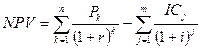 Допустим, делается прогноз, что инвестиция (IС) будет генерировать в течение п лет годовые доходы в размере P1, P2.... Рп. Общая накопленная величина дисконтированных доходов (PV) и чистый приведенный эффект (NPV) рассчитываются по формулам: