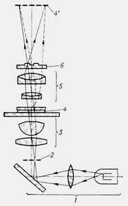 В типичной для этого метода схеме (рис. на стр.9) в переднем фокусе конденсора 3 устанавливается апертурная диафрагма 2, отверстие которой имеет форму кольца. Её изображение возникает вблизи заднего фокуса объектива 5, и там же устанавливается т. н. фазовая пластинка 6, на поверхности которой имеется кольцевой выступ или кольцевая канавка, называемая фазовым кольцом. Фазовая пластинка может быть помещена и не в фокусе объектива (часто фазовое кольцо наносят прямо на поверхность одной из линз объектива), но в любом случае неотклонённые в препарате 4 лучи от осветителя 1, дающие изображение диафрагмы 2, должны полностью проходить через фазовое кольцо, которое значительно ослабляет их (его делают поглощающим) и изменяет их фазу на l/4 (l — длина волны света).
