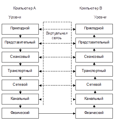 Разные уровни систем не взаимодействуют друг с другом напрямую, а только через физический уровень. Постепенно переходя с верхнего уровня на нижний, данные непрерывно преобразуются и снабжаются дополнительной информацией, которая анализируется протоколами соответствующего уровня на стороне получателя. Это создает эффект виртуального взаимодействия уровней между собой.