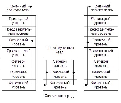 На рис. 16. показан пример конкретной многоуровневой архитектуры компьютерной сети. Между отправителем информации и получателем включен промежуточный узел. Пакет, поступающий по физической среде, связывающей исходный узел с промежуточным, направляется на сетевой уровень этого узла, на котором определяется следующая часть пути в составе маршрута через сеть.