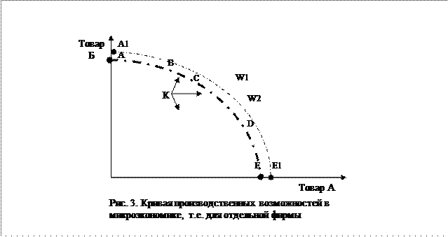 Каждая точка на кривой представляет некий максимальный объем производства любых двух продуктов в результате полного использования имеющихся у общества ресурсов. Точки, находящиеся вне кривой, например W1 и W2, оказались бы предпочтительнее любой точки на кривой АЕ. Но это на практике неосуществимо при данном количестве ресурсов у общества и имеющихся технологиях.