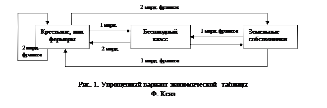 Изучая процесс создания потребительских благ, Ф. Кенэ составил первую в истории экономическую таблицу. Он по профессии был придворным медиком короля Франции Людовика ХУ. Поэтому основательно знал, как функционирует человеческий организм. И вот по аналогии с ним, он составил свою экономическую таблицу (рис. 1). Выглядела она довольно просто: