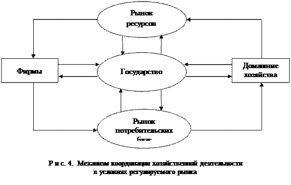 3. Товарное производство регулируемого рынка. Оно формируется в условиях монополизации экономики. Отмечается сочетанием государственного и частного секторов с высокой долей каждого в производстве, распределении, обмене и потреблении ресурсов, материальных благ и услуг. Экономика регулируется в равной степени, как государством, как монополиями, так и с помощью рынка (рис. 4).