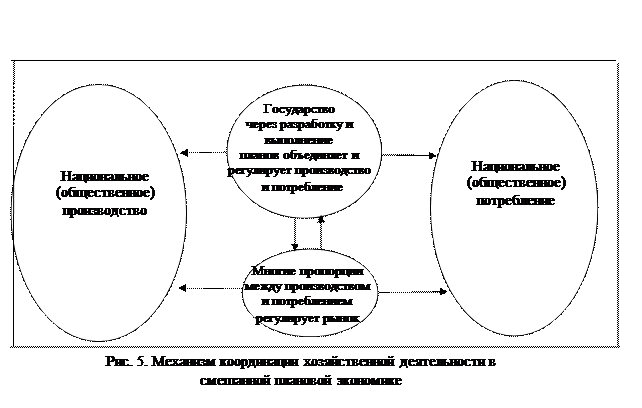 Под планомерным понимается такое хозяйство, при котором продукты производятся по единому государственному плану для удовлетворения личных и общественных потребностей. Связь между производством и потреблением устанавливается не через рынок, а через государство как единый экономический центр страны (см. рис. 5). В результате производство и потребление вновь соединяются воедино, как это было в традиционной экономике, но только не в рамках отдельного хозяйства, а в масштабе общества.