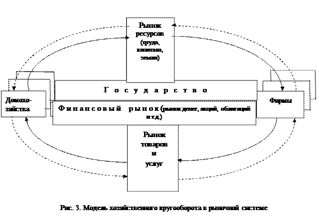 В рыночной экономике выделяют три объекта и три субъекта. В качестве объектов выступают рынок ресурсов, рынок продуктов и финансовый рынок. К субъектам рыночной экономики относят домохозяйства, фирмы, государство. Объекты и субъекты тесно взаимосвязаны потоками товаров, услуг, денег и доходов. Все потоки в идеале должны быть сбалансированы между собой. На рис. 3 показана упрощенная модель кругооборота ресурсов, продуктов и дохода.