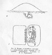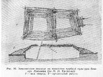 М. П. Грязнову удалось особенно хорошо проследить и объяснить конструкцию землянки № 3. Выяснилось, что при помощи пирамидального сруба над землянкой устраивалась шатровая крыша (доп.9). К этому основному срубу сбоку пристраивался еще один сруб меньшего размера. Сверху остов кровли покрывался хворостом, камышом, травой и затем засыпался слоем плотно утрамбованной земли. В таком виде землянка была снаружи очень похожа на небольшой курган.