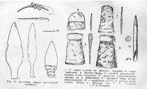 Основным хозяйственным орудием был проушной бронзовый топор, производительность которого была довольно высока. Для срубной культуры характерны вислообушные бронзовые топоры (доп.14), хотя встречаются иногда и другие типы. Применялись еще и каменные топоры-молоты. Бронзовые листовидные ножи усовершенствовались. В отличие от более ранних они уже имели хорошо выраженные уступы, отделяющие лезвие от черенка рукоятки. Такие ножи хорошо резали мягкий материал (кожу, дерево), а большие экземпляры могли использоваться как кинжалы. Однако кремневые ножи еще не вышли из употребления как более доступные и более приспособленные для обработки твердых материалов (кость, рог). По-прежнему встречаются четырехгранные шилья; некоторые из них бывают вставлены в костяные ручки. Изредка попадаются бронзовые иглы с ушком, напоминающие современные стальные швейные иглы очень крупных размеров. Найдены узкие и длинные клиновидные тесла и втульчатые долота с узким лезвием.