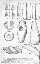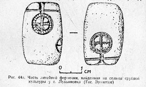 Очень интересный, но не сохранившийся полностью клад бронзовых вещей был найден в 1956 г. одним местным жителем у станции Карачёвка. В кладе были бронзовые крюкастые серпы, наконечник копья, мотыга и еще один предмет, форму которого нельзя установить. К сожалению, для Археологического музея Харьковского университета удалось приобрести только одну бронзовую втульчатую мотыгу. Остальные вещи были уничтожены нашедшим. На древнем поселении у с. Пески Радьковские найдены кремнёвый нож, несколько овальных кремневых скребков, метательные шаровидные камни для пращи, кварцитовый терочник, отщепы. Хотя в обеспечении племен срубной культуры в Причерноморье металлическими изделиями по-прежнему еще значительную роль играл северокавказский металлургический центр, все же имеются разнообразные следы и местного металлургического производства. Кроме упомянутых выше находок необходимо отметить еще половинку литейной формочки из мергеля, обнаруженную на селище срубной культуры у с. Лукьяновка на р. Оскол при раскопках К. Г. Болтенко в 1934 г. На одной стороне прямоугольной формочки, которая хранится сейчас в Гос. Эрмитаже, вырезан шаблон для отливки украшения в виде колесовидной подвески с ушком (доп.17). На обратной стороне имеется поврежденный шаблон для отливки такой же подвески и еще часть подобного шаблона. Все это указывает на то, что каменная формочка использовалась долго. После того, как старые шаблоны приходили в негодность, каменную плитку не выбрасывали, а на свободном месте вырезали новый шаблон. Следовательно, на селище у с. Лукьяновка в течение длительного времени было организовано массовое производство украшений, (которые пользовались несомненно большой популярностью. Надо полагать, что дело не ограничивалось только украшениями. По-видимому значительное количество бронзовых орудий производства и предметов вооружения изготавливалось в эту эпоху также местными мастерами.