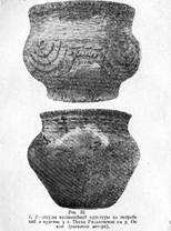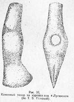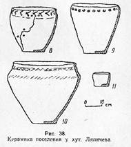 По-видимому, этим временем датируется обнаруженная В. А. Городцовым стоянка на берегу озера Чернецкого, около хут. Хайловщина (Зливки) в Донецкой обл. Здесь, кроме обломков глиняных горшков и жаровень, были найдены каменные зернотерки, глиняные пряслица от веретен, полированный топор-молот из диорита, кремневый скребок, бронзовое шило и медные шлаки, свидетельствующие о местной плавке металла. К этой же группе принадлежит стоянка у ст. Васищево, в Харьковской обл., где интересный подъемный материал собрали А. А. Потапов и И. Н. Луцкевич, и поселение у с. Пески Радьковские, на берегу Оскола, где в 1956 г. автору удалось вскрыть часть земляночного жилища, по-видимому, такого же устройства, как и на стоянке у хут. Ляпичева.