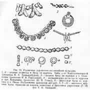 Украшения в женских могилах срубной культуры встречаются в небольшом количестве. Среди них можно отметить бронзовые спиральные височные кольца в полтора оборота, ребристые пронизи, желобчатые и круглые в сечении браслеты, бронзовые и мелкие ластовые бусы.