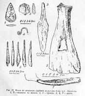 Из предметов вооружения чаще всего попадаются наконечники стрел. Их обычно делали из кремня, реже — из кости. Но в самом конце бронзового века уже появляются, хотя и в очень небольшом количестве, массивные втульчатые наконечники стрел из бронзы. Втульчатые наконечники копий, сделанные из бронзы, и бронзовые кинжалы встречаются редко.