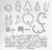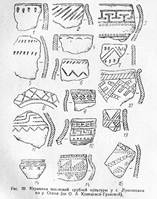 оселения срубной культуры, как уже отмечалось, зафиксированы и в ряде пунктов бассейна Донца. К наиболее ранним, датируемым первым периодом развития срубной культуры (XVI—XIV вв. до н. э.), О. А. Кривцова-Гракова относит стоянки у с. Герасимовки и у с. Лукьяновки на р. Оскол. На лукьяновской стоянке обнаружены остатки жилищ, аналогичных жилищам у хут. Ляпичева. Керамика лукьяновской стоянки (доп.12) в основном сходна с керамикой поволжских поселений срубной культуры, но имеет все же ряд особенностей. Здесь у многих сосудов темная почти черная лощеная поверхность. В орнаментации наряду с простыми узорами встречаются весьма сложные, образованные отпечатками шнура или зубчатого штампа. Особо надо отметить наличие сосудов, у которых вдавленные или врезанные линии узора заполнены белой пастой. Керамика этого типа обнаружена не только на поселениях данной территории, но и в курганном погребении близ ст. Борки.
