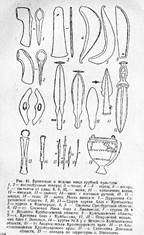 Особенно знаменательно для этой эпохи появление довольно разнообразных земледельческих орудий. Кроме каменных и роговых мотыг встречаются уже мотыги, сделанные из бронзы. В качестве мотыг могли применяться и упомянутые выше длинные клиновидные тесла. Широкое распространение получают бронзовые серпы с массивным лезвием и небольшим крюком на конце, который служил для упора руки(доп.15). Для очистки предназначенного под посев участка земли от кустарника и бурьяна употреблялись специальные косари. Впрочем, функции этого орудия, как правило, заметил Н. Я. Мерперт, были более разнообразны. При помощи такого косаря или секача обрубали сучья и грубо обрабатывали стволы срубленных деревьев, заостряли колья и выполняли другие аналогичные работы. Для размола зерна применялись каменные зернотерки.