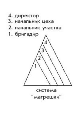 Система “матрешка” построена так, что права и ответственность вышестоящего руководителя полностью поглощают права и ответственность нижестоящих руководителей.