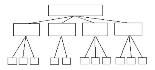 Механистическая или бюрократическая структура управления (рис. 5) - это исторически первый тип структур. Концепцию подхода к построению этого типа структур разработал немецкий социолог Макс Вебер, предложивший нормативную модель так называемой рациональной бюрократии. Отсюда и название структур. Применение термина “механистический” к структуре управления показывает, что структура создана наподобие машинного механизма.