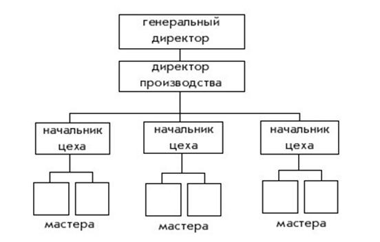 В линейной структуре управления формируется своего рода иерархия руководителей данной конкретной организации (например, зав. секцией, начальник отдела, директор магазина, генеральный директор АО; сменный мастер – старший мастер – начальник цеха – директор предприятия).