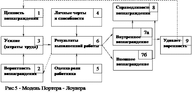 Согласно модели Портера–Лоулера, результат(6), достигнутый сотрудником, зависит от 3 факторов: от усилий или затрат труда (3), способностей и навыков (4), оценки своей роли в процессе труда (5).