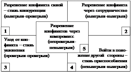 Исходя из данной модели выделяют пять способов разрешения конфликтов: