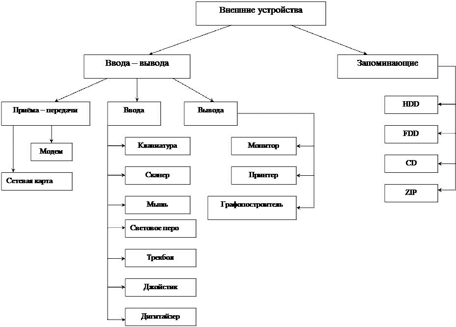 Внешними – называются устройства, которые размещены вне системного блока, но участвуют в том или ином этапе обработки информации. В их состав входят: внешние запоминающие устройства и у стройства ввода – вывода. Понятие «внешнее» устройство весьма условно. (Жесткий диск, CD – ROM, модем - могут быть размещены как внутри системного блока, так и вне его).
