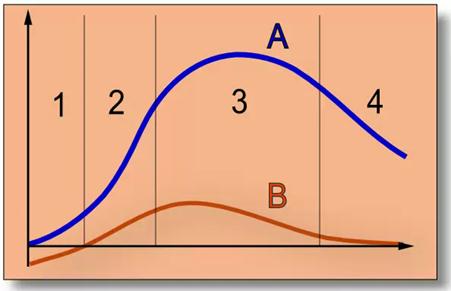 Графики, характеризующие изменение показателей в различные фазы жизненного цикла. 1-Фаза выхода на рынок; 2-Рост; 3-Зрелость; 4-Упадок. А - продажи; B - прибыль.