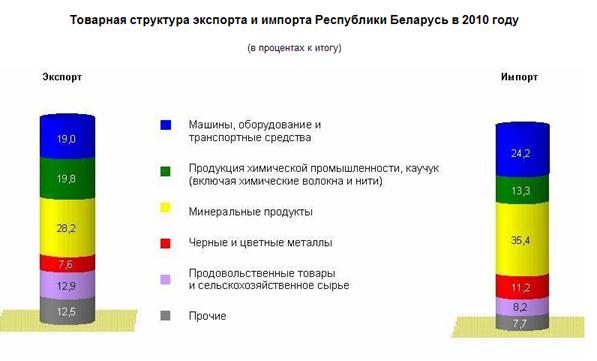 Особенности промышленного комплекса Республики Беларусь, ее географическое положение и исторические связи определили высокую степень открытости экономики республики, ее ориентированность на внешние рынки. Объем экспорта товаров составляет около 50% валового внутреннего продукта страны, импорта – около 60%.
