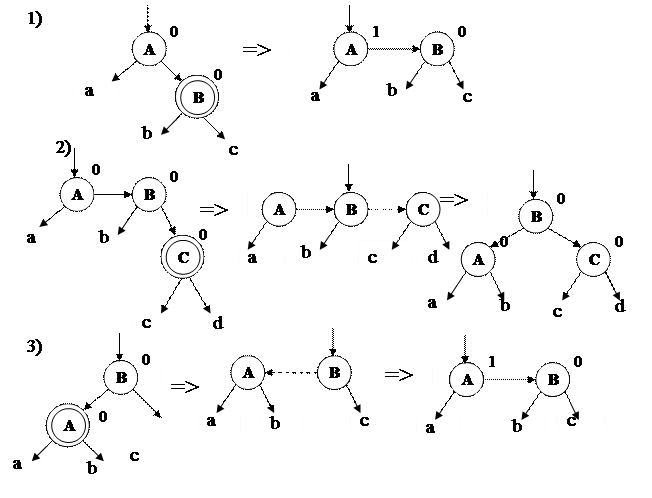 В случае роста левого поддерева, если вершина В одна на странице (3), то вершина А добавляется на эту страницу. Однако левая ссылка не может быть горизонтальной, поэтому требуется переопределение ссылок (HR=1, баланс вершины А равен 1). Если на странице два элемента, то, как и в случае 2, средняя вершина В поднимается на вышестоящий уровень (VR=1, баланс вершины В равен 0).