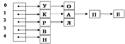 Пример. Составить хеш-таблицу для строки КУРАПОВА ЕЛЕНА. Будем использовать номера символов в алфавитном порядке. Пусть m =5,
